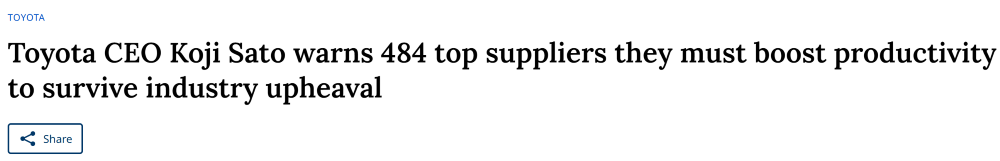 而从CEO佐藤恒治本周向供应商发出警告可以看出,全球第一大车企在面对竞争压力的情况下,也要加速寻求改革了。